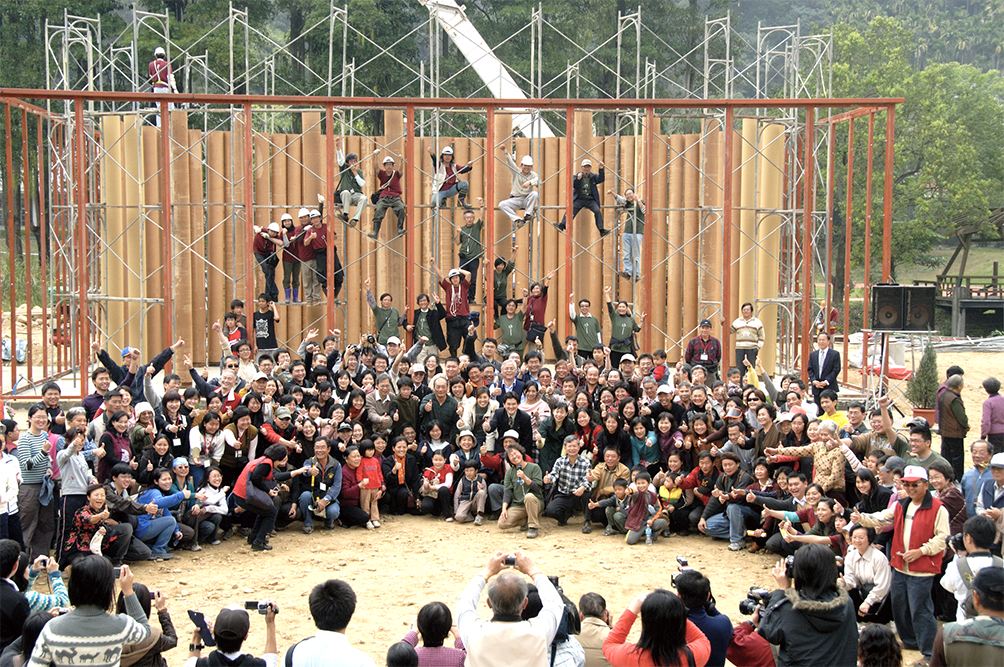 清晨,天空仍飄著細雨,宋奇易一早便趕到工地,清理積水、檢查工具,並安排所有工作人員就定位。他手下各工班的工頭們也以志工的身份全數到場。上午8點,雨歇,來自台灣各地的社造夥伴陸續抵達現場。9點,鏗鏘的樂音響起,雲林崙背的貓兒干北管團為「千人立柱」活動揭開序幕。山丘上,義工們與黃泰吉、廖德蘭夫婦率領的南投空手道少年少女,正準備搬運紙管。